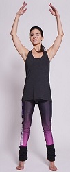 Gleichgewicht halten. Langsam Fersen setzen und die Arme seitlich wieder nach unten senken.